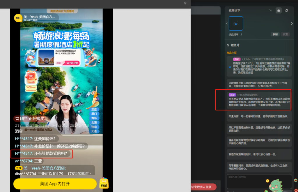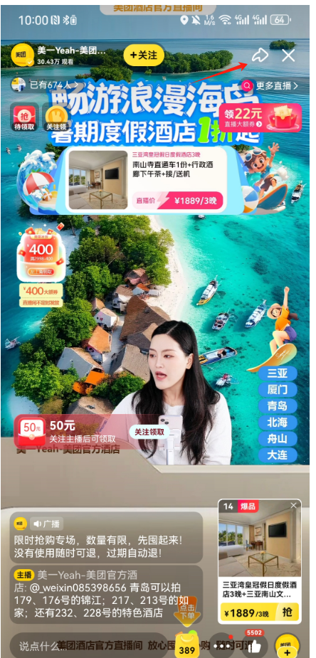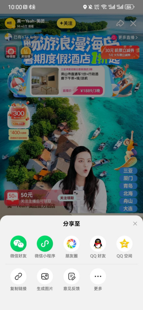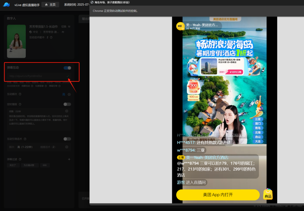 美团连接弹幕需要手机上进入美团APP,点进需要连接弹幕互动的直播间,复制链接进行弹幕连接,下图为任意直播间示例