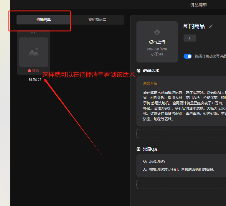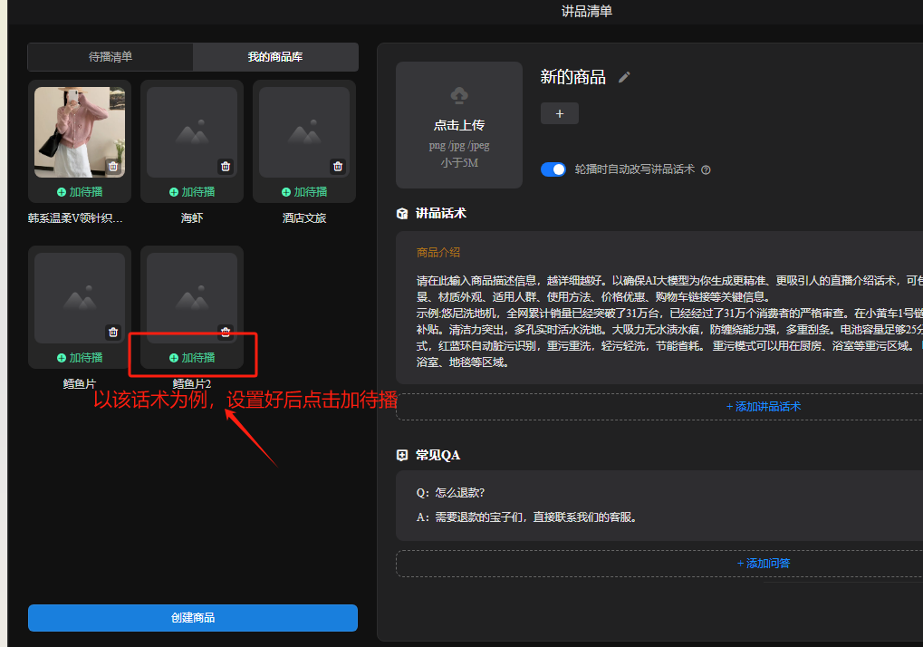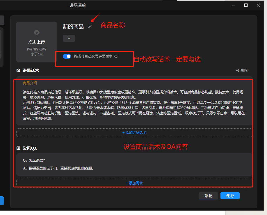 先创建商品,然后设置商品名称,将自动改写话术勾选,再设置商品的话术以及一些QA问答,最后保存。