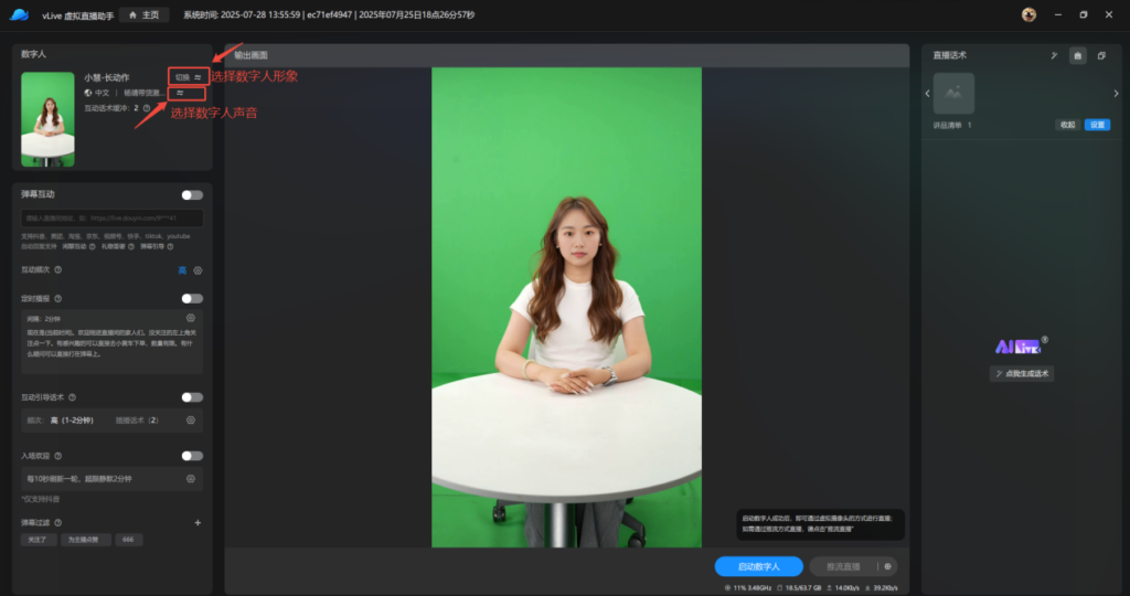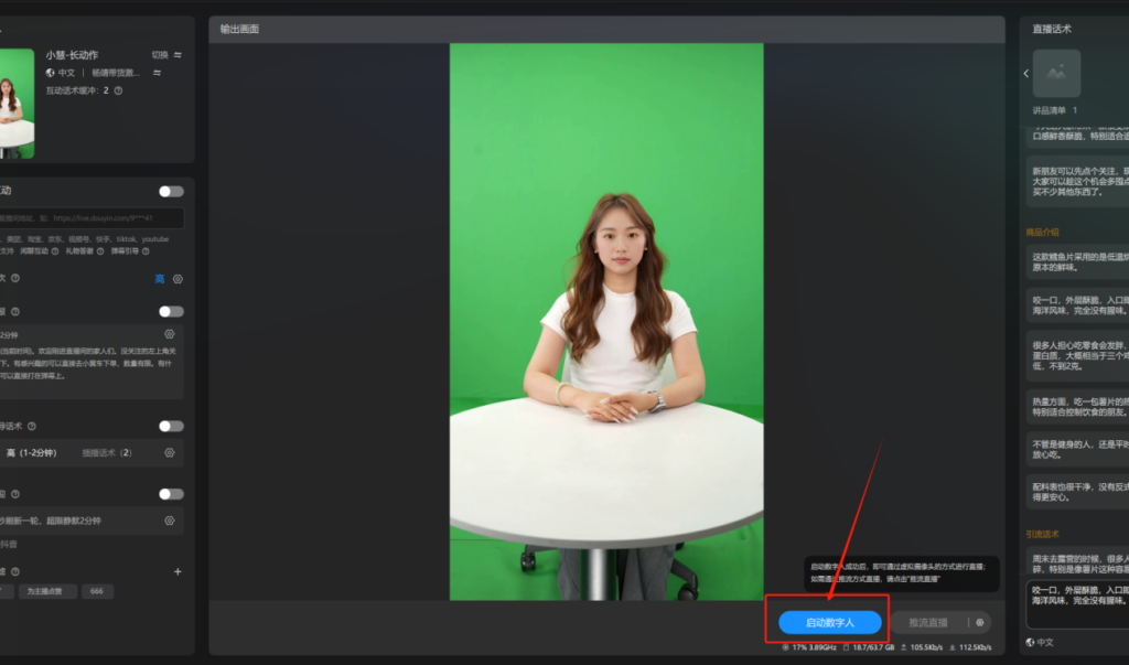 话术设置完成后,就可以开启数字人直播,点击启动数字人,等待大概1-2分钟
