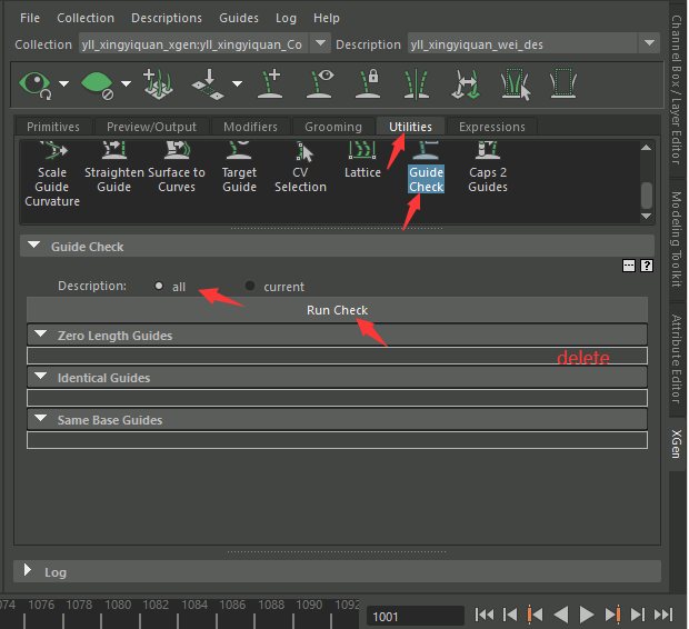 如果是Modifiers的问题就分两种情况第一种情况就是xgen重合的引导曲线,我们使用xgen自带的Guide Check检查工具进行删除,然后通过delete删除重合的引导曲线重新整理毛发资产,重新输出解算。